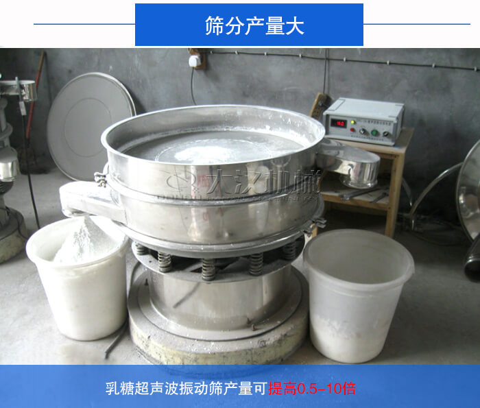 超聲波振動篩比不安裝超聲波的振動篩過網率增加5-20倍,篩分精度可提高1—70%,在保證篩分效果的前提下,乳糖超聲波振動篩產量可提高0.5-10倍。