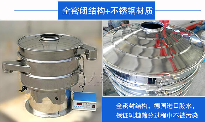 乳糖超聲波振動篩以全密封結構,再加上硅膠或橡膠材質的密封件進行密封,然后德國進口膠水達到更好的密封效果,可以保證乳糖篩分過程中不被污染。另外,對于乳糖篩分來說,對其篩分環境的衛生程度也有一定的要求,所以我們的超聲波振動篩選取的是304不銹鋼材質,經由技術人員的拋光處理,操作更安全衛生。