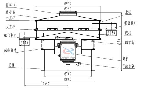 1000單層旋振篩采用YZUL立式振動電機作為激振源,通過振動電機上下兩端的偏心重錘將旋轉運動轉變為水平、垂直、傾斜的三次元運動,并傳遞到旋振篩的篩面上;物料通過入料口進入設備內,根據不同物料篩分要求,物料經過1-5層采用不同目數的金屬編織篩網的篩分層,在這個過程中,位于各層的篩網下的清網裝置(彈跳球)通過頻率振動不斷撞擊不銹鋼篩網,使篩網上層物料能夠順暢的透網篩分,并有效解決了物料堵網問題出現,不同目數的物料通過各層對應目數的篩網后在各層的出料口排出,終實現篩選除雜或過濾分級的目的。