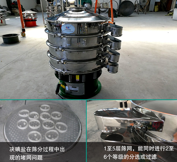 不銹鋼振動(dòng)篩內(nèi)部裝配有彈跳球清網(wǎng)裝置,可以有效解決碘鹽在篩分過(guò)程中出現(xiàn)的堵網(wǎng)問(wèn)題,提高了篩機(jī)的篩分效率。此外,不銹鋼振動(dòng)篩可篩1至5層篩網(wǎng),能同時(shí)進(jìn)行2至6個(gè)等級(jí)的分選或過(guò)濾,篩分更加高效。 干凈衛(wèi)生